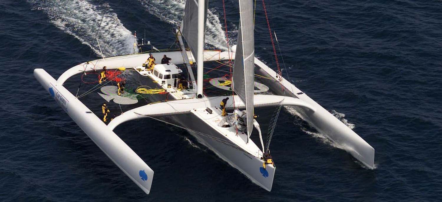 Entièrement construit en carbone et en nid d’abeille, Geronimo a un cahier des charges simple : remporter le Trophée Jules Verne, dont son skipper est un habitué. Chose faite trois ans après sa mise à l’eau, au cours de l’hiver 2003-2004, avec un chrono d’un peu plus de 63 jours.