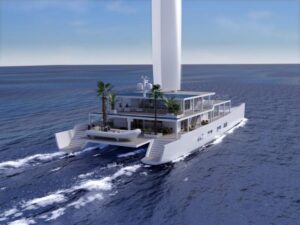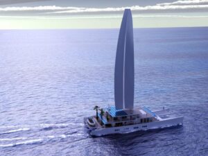 Pour son dessin, le cabinet VPLP Design a repris le concept du Manifesto avec de très larges espaces qui font à la fois offices d’ateliers extérieurs et intérieurs, mais aussi de lieux d’habitation, et une propulsion via la fameuse oceanwing, aile affalable et arisable chère au cabinet.