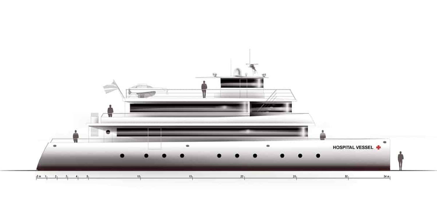 Dans le même ordre d’idée que la bateau-ambulance qui a vu le jour, cet Hospital Vessel est un avant-projet développé avec un médecin qui souhaitait un bateau-hôpital destiné à soigner et opérer des populations habitant en milieu reculé, notamment fluvial.