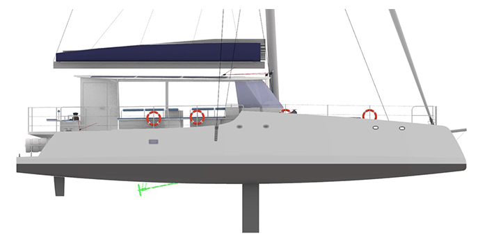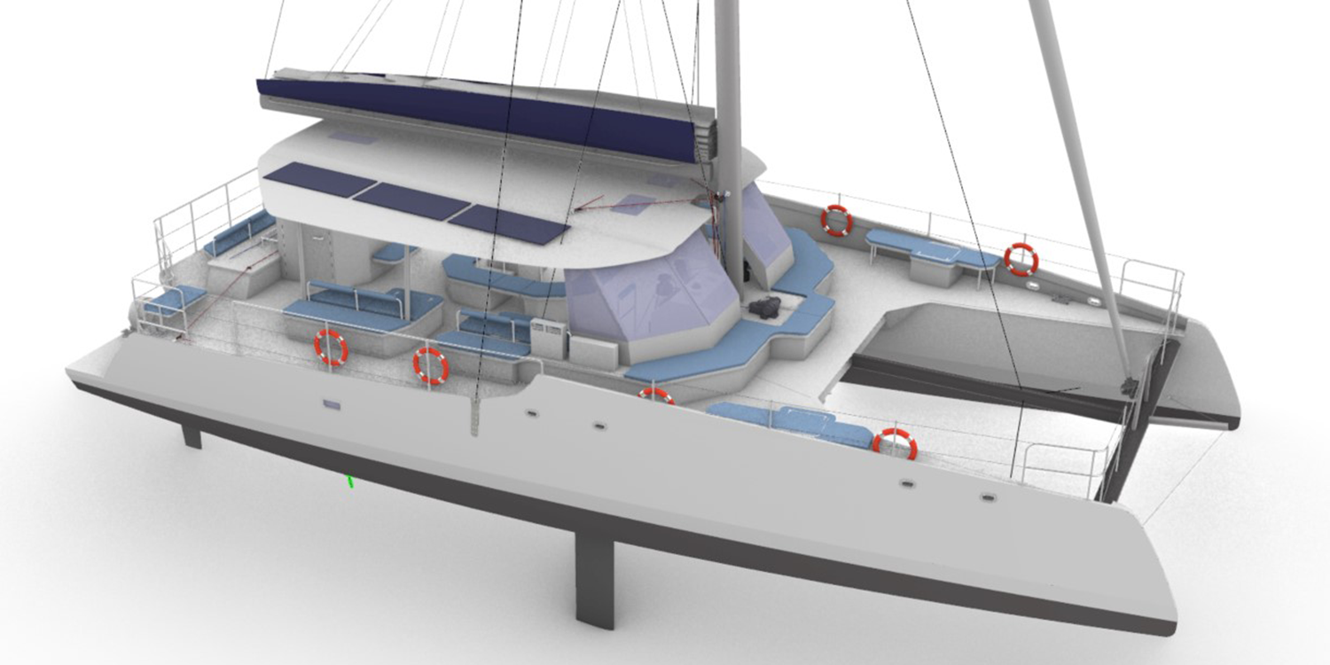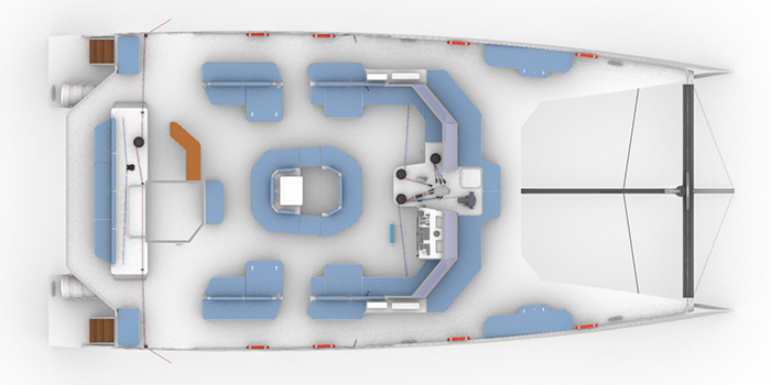 Le plan de pont est modulable afin de satisfaire ce cahier des charges spécifique : embarquement de passagers maximisé en catégorie 3 et allant jusqu’à 80 personnes en catégorie 4, toilettes PMR, circulation pour fauteuils roulants, emport de bagages et vélos… Le poste de barre a été positionné à l’avant afin de donner une vue dégagée au skipper qui y a accès à toutes les manœuvres. Ce bateau est également généreusement toilé afin de maximiser l’usage de la voile, même dans le petit temps.