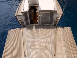 Le BBM est la version moteur du BBS, qui bénéficie naturellement d’une carène un peu différente. Un soin particulier a été porté à la circulation intérieure. Le BBM est doté d’un cockpit à l’avant avec un accès direct à la cabine, et d’un cockpit arrière dont les hiloires se déplient et sur lequel on peut installer une grande table familiale avec une cuisine et une plancha à proximité immédiate.