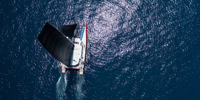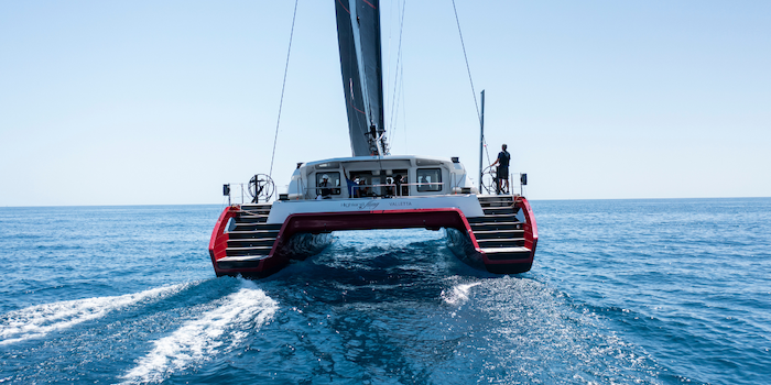 Capable de monter sur une coque, doté de grandes dérives asymétriques et de safrans en T à l’arrière, le Gunboat 80 a été poussé à l’extrême en masse pour gagner en performance, puisqu’il ne pèse que 28 tonnes pour 80 pieds.