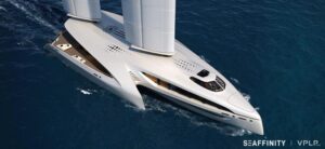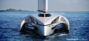 Seaffinity est un trimaran super profilé qui illustre la vision de VPLP Design d’un yacht du futur, silencieux, automatisé en partie, et propulsé par une énergie vertueuse, le vent.