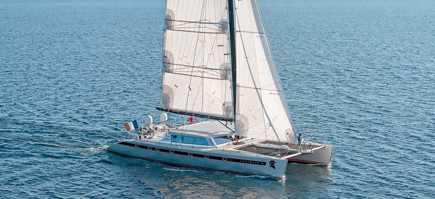 Lancé en 2003, ce catamaran classique et rapide de 77 pieds (23,70 mètres) a été conçu pour naviguer essentiellement en Méditerranée et aux Antilles.